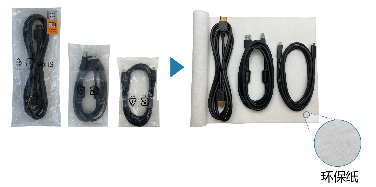 为了向越来越可持续的生产方式转变,显示器附带的线缆被包裹在环保纸中,而不是塑料袋中。