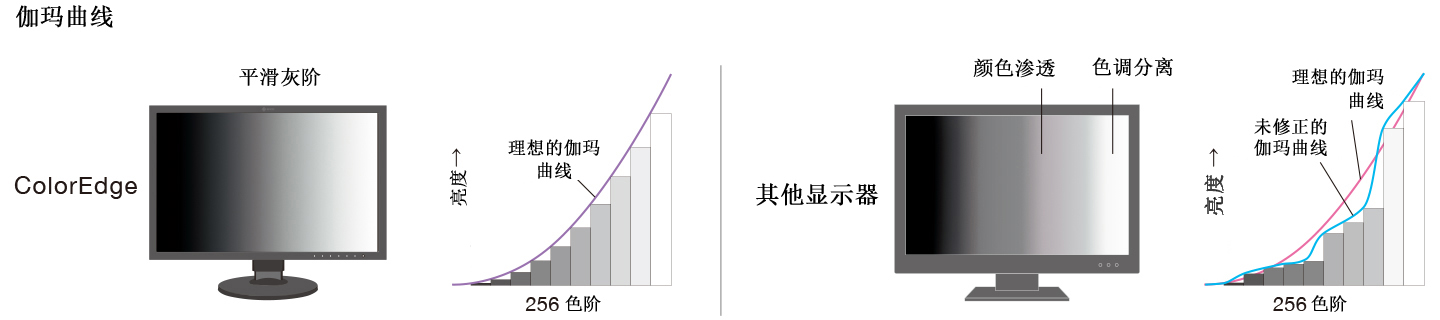 每台ColorEdge显示器在出厂前伽玛值均被调校。通过测量从0-255的R、G和B的伽玛值,然后使用显示器的16位的查找表(LUT),选择256个最合适的色调值,可确保图像的色阶变化平滑。