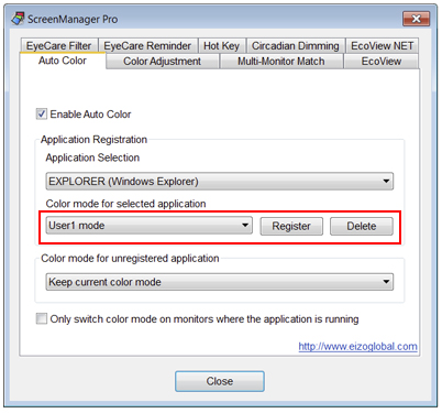 使用"Auto Color"为每个应用程序设定的理想屏幕设置。使用此功能,您可以将任何预设模式分配给特定的应用程序。当你激活该应用程序时,你的屏幕立即切换到指定的模式。